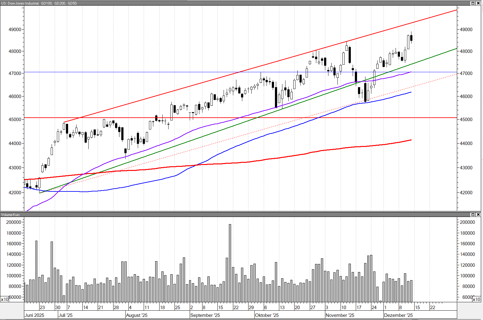 Chart Dow Jones-Trend 14.12.2025: rot = 200-Tage-Linie, blau = 100-Tage-Linie, grüne Trendgerade = Begrenzung Aufwärtskanal