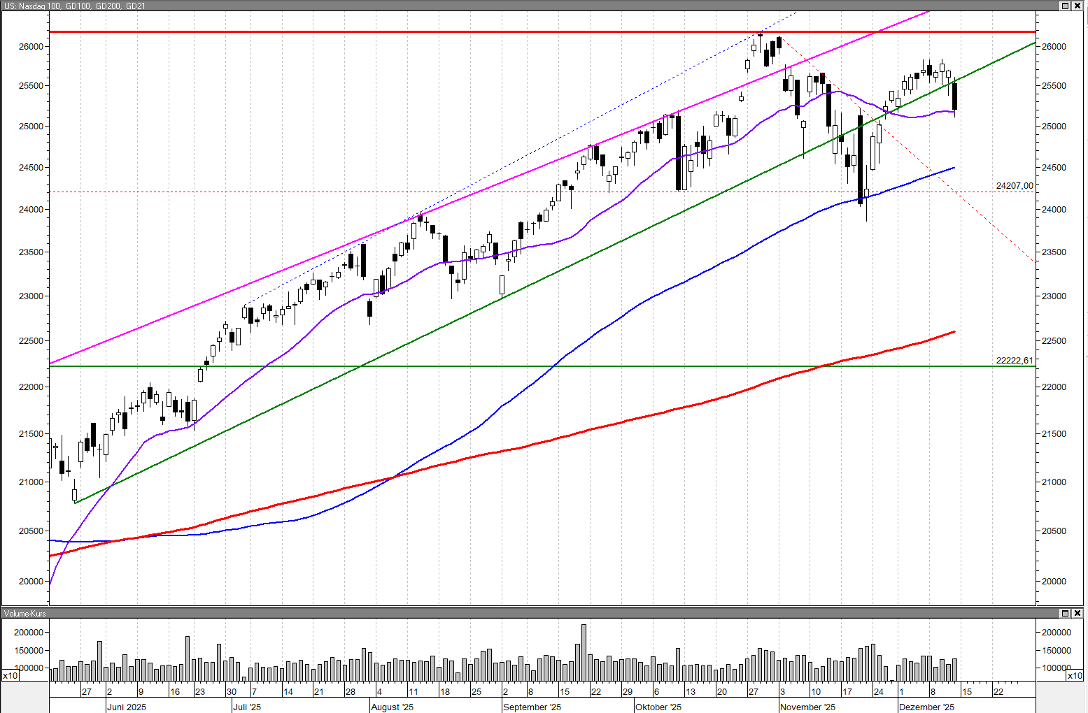Chart Nasdaq100-Trend 14.12.2025: rot = 200-Tage-Linie, blau = 100-Tage-Linie, grüne Trendgerade = Begrenzung Aufwärtskanal