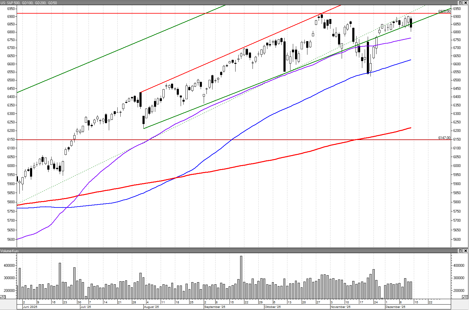 Chart S&P500-Trend 14.12.2025: rot = 200-Tage-Linie, blau = 100-Tage-Linie, grüne Trendgerade = Begrenzung Aufwärtskanal
