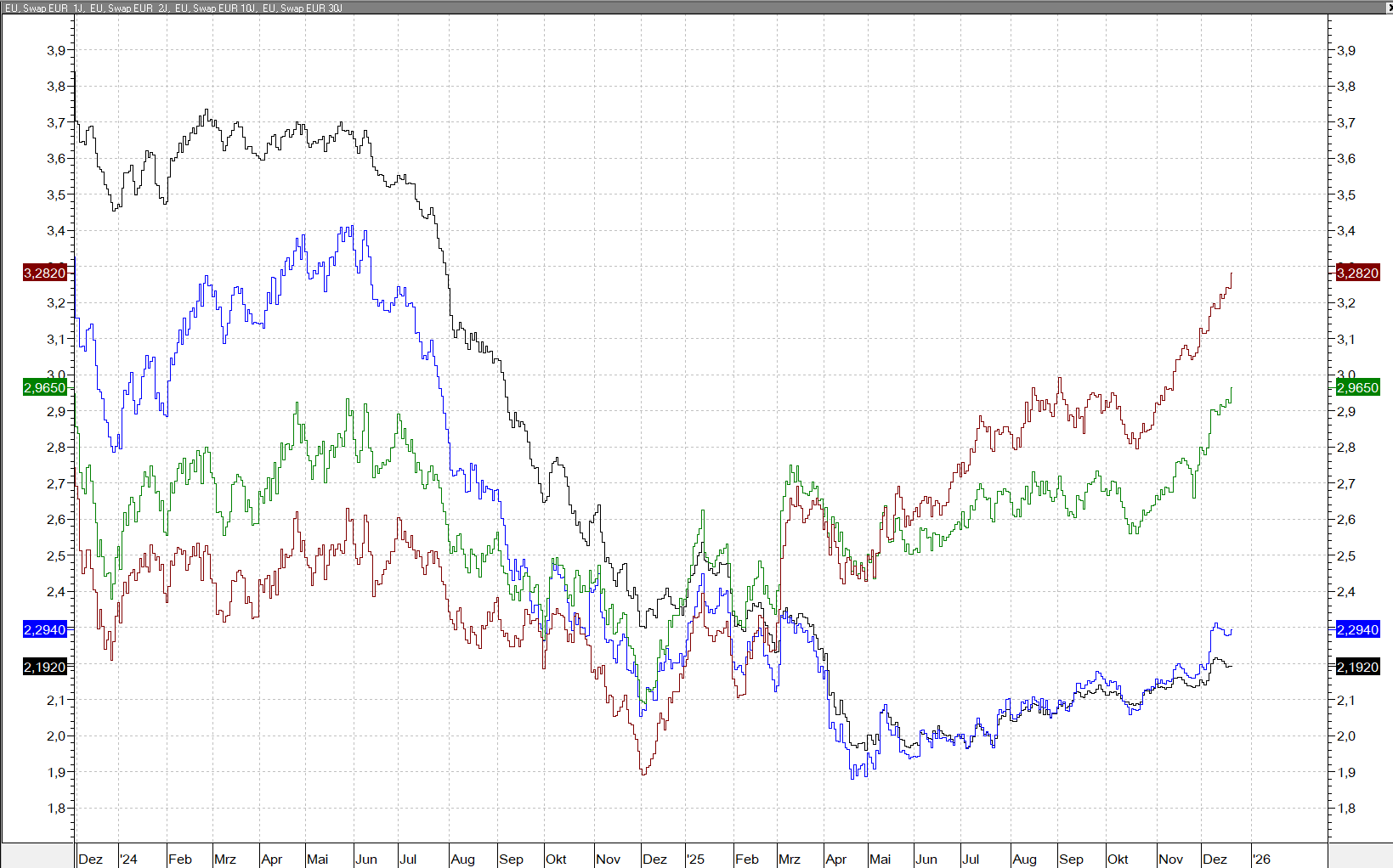Während die Märkte weiter von sinkenden Zinsen im Dollar ausgehen, wie in den vorherigen Kommentaren bereits mehrfach dargestellt, steigen im Euro-Raum die Renditen inzwischen wieder, und zwar auf allen Zeitskalen: sowohl die 1-jährigen als auch die 2-, 10- und 30-jährigen Renditen steigen seit Mai kontinuierlich an.