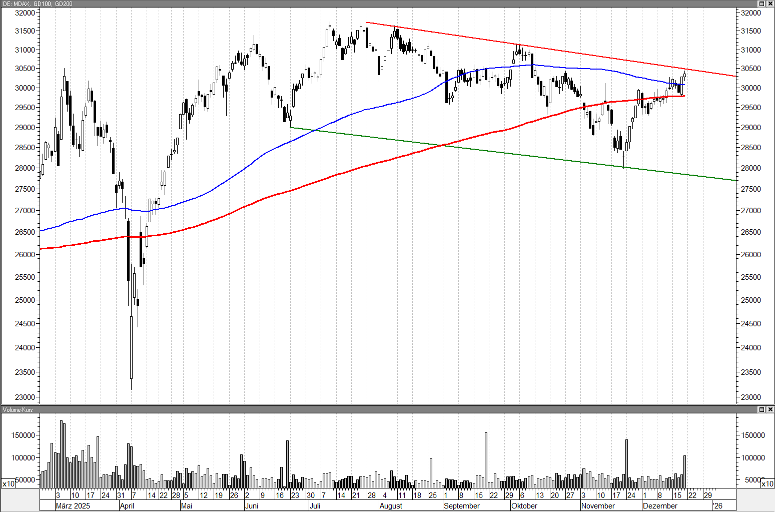 Der MDAX ist zum Ende der Woche nun endgültig an der oberen Kanalbegrenzung seines mittelfristigen Seitwärts-Abwärts-Bandes angekommen, so dass auch hier eine Kursumkehr sehr wahrscheinlich ist.