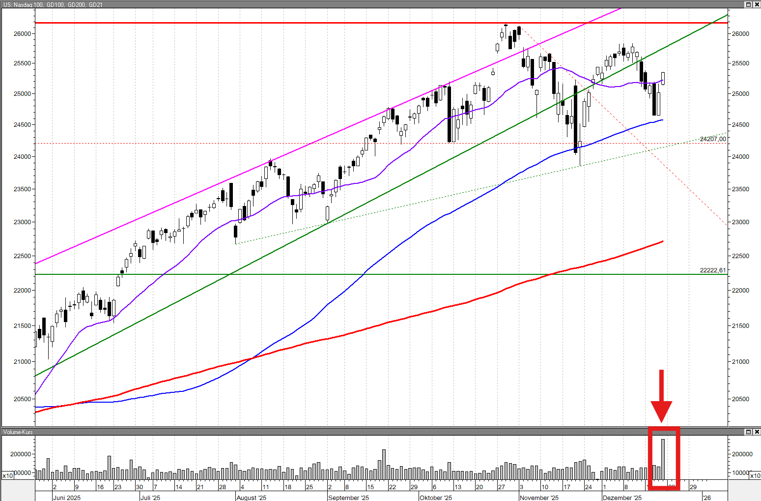 Bei dem Nasdaq-100-Chart sieht man schön das (selbst für einen Hexensabbat) ungewöhnlich große Handelsvolumen. Für den kurzfristigen Abwärtstrend mag das eine Verschnaufpause sein. Eine Trendumkehr erwarte ich basierend darauf jedoch nicht – ich denke, wir werden schwächere Kurse in der kommenden Woche sehen.